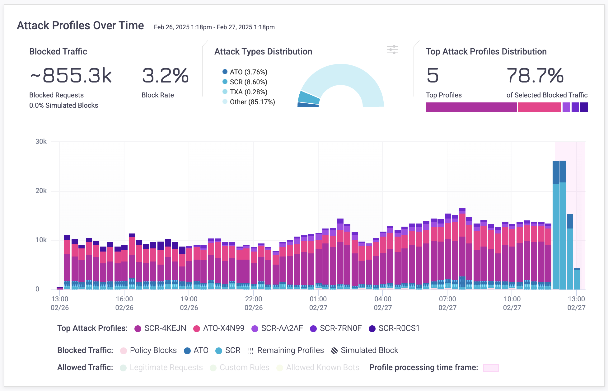Attack Profiles have a processing time, which means that HUMAN Sightline is still analyzing all the traits in the traffic in that time frame to assign them to a Profile. This time frame is highlighted in the Attack Profiles Over Time graph and typically finishes in two hours.