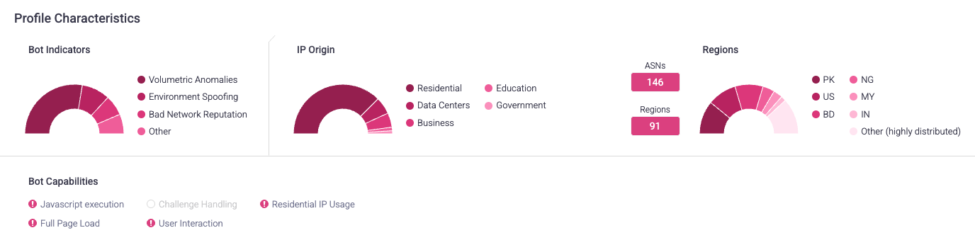 It also shows how many autonomous system numbers (ASNs) and regions the bots came from. Higher numbers typically indicate that the bots that made the requests are more sophisticated and trying to act more like humans. However, this doesn’t necessarily mean Profiles with low numbers aren’t sophisticated. For example, bots that use residential IPs, or Residential IP Usage, tend to be more sophisticated. In that case, you’d also expect that the number of regions is low, because that type of traffic typically is concentrated from the U.S.