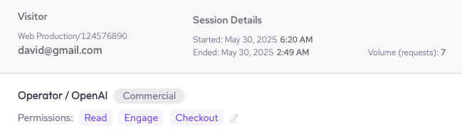Session details has more granular information about each AI agent session and lets you learn more about the agent’s activity. You can view them by clicking on any session in the Visitors table. Each one has information about the agent and the summary at the top, as well as the agent’s current permissions. If you want to update these permissions, you can click on edit