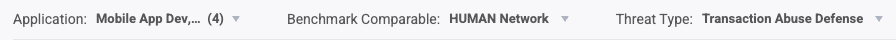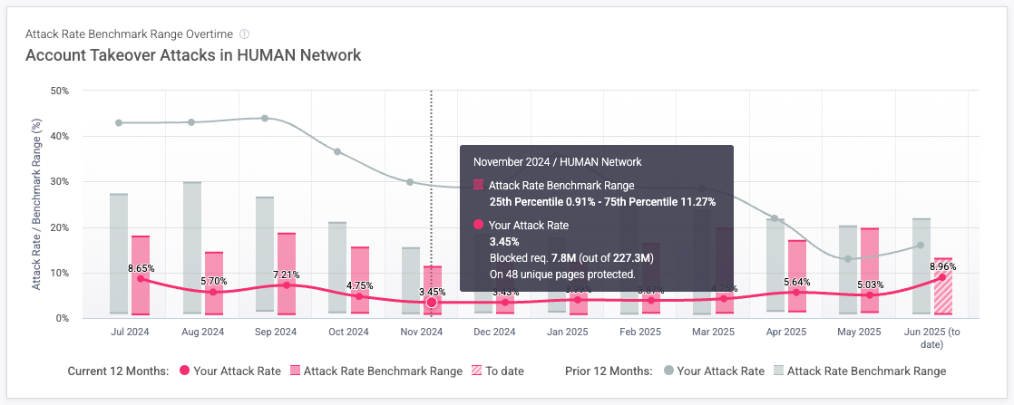 - Your Attack Rate (%): The rate of attacks for the selected threat type on the protected paths and selected applications. Calculated by the number of requests mitigated by HUMAN ÷ the total number of requests × 100.