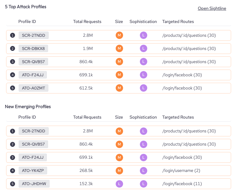Finally, you can review the 5 Top Attack Profiles and New Emerging Profiles. These list the five most common Attack Profiles with the most requests and five new Profiles with the most requests. This also lists each Profile’s size, sophistication, and the routes they were targeting. For more information, see About Attack Profiles.