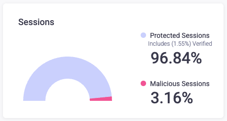 The Sessions distribution and statistics show how many sessions Sightline has protected or blocked within your selected time range. This is useful for understanding how many legitimate sessions Sightline has protected and how many malicious ones it’s blocked. Malicious sessions can be especially interesting because sophisticated bots typically attempt to act like legitimate users and have sessions.