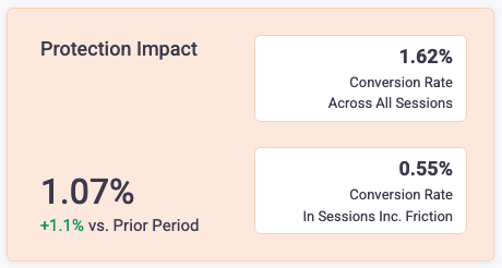 - Protection Impact: The difference between the Conversion Rate Across All Sessions and the Conversion Rate in Sessions including Friction. This also shows the change in protection impact compared to the last period, which is determined by your selected time range. For example, if you have the last 7 days selected, then Sightline will compare to the 7 days before that.
