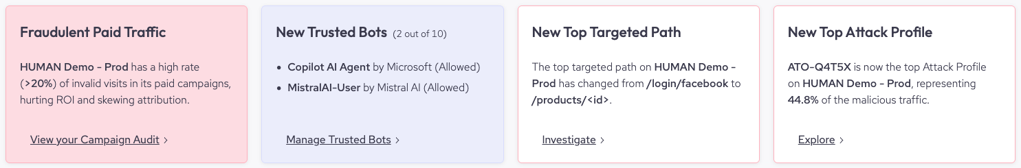 The Insights highlight interesting updates or critical items that need your review. These include changes to the most commonly targeted path, new trusted bots, your current IVT rate, and others. You can refer to these insights if you’re not sure what to address next in your Sightline configuration.
