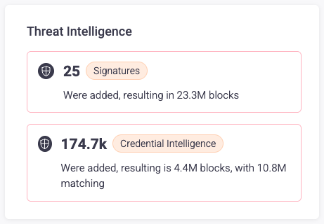 - Credentials Intelligence added: The total number of compromised credentials HUMAN added to its database across HUMAN’s customer network. HUMAN hashes and salts these credentials before it stores them. You can also see the number of blocked requests due to Sightline flagging a request with these credentials and the number of your users’ accounts that match these credentials.