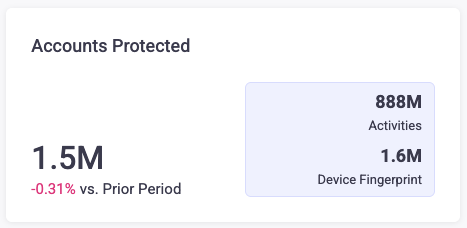 - Total accounts protected: The total number of accounts protected. This also shows the change in accounts compared to the last period, which is determined by your selected time range. For example, if you have the last 7 days selected, then Sightline will compare to the 7 days before that.