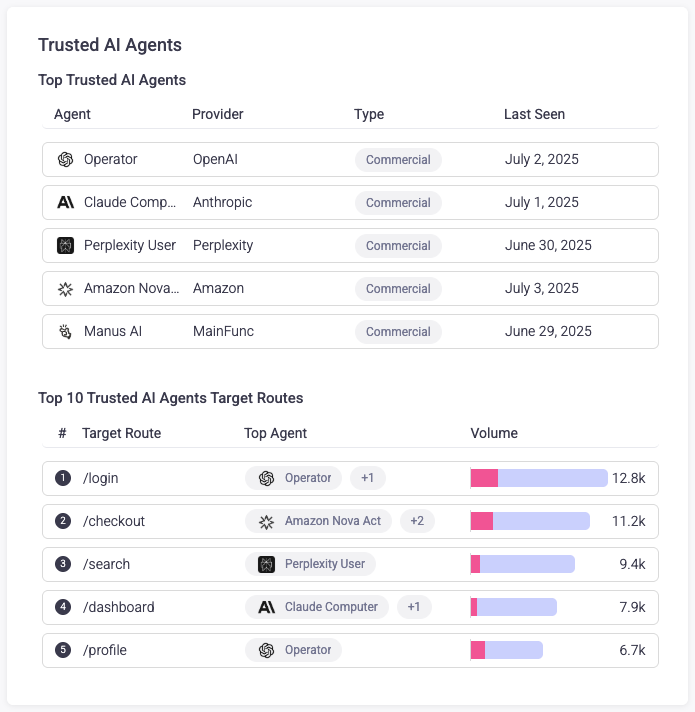Trusted AI Agents summarizes information about common AI agents that visit your applications and where they’re active.