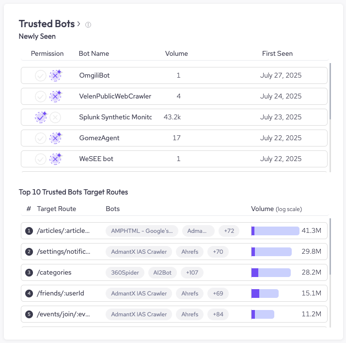 - Top 10 Trusted Bots Target Routes: Lists the most common routes on your application that the 10 most active trusted bots visited. You can also view the volume of bot traffic and legitimate traffic for each route.