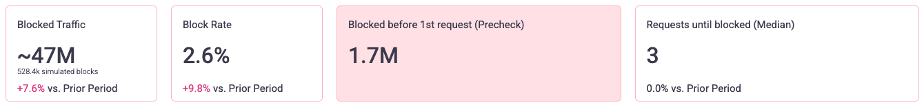 - Blocked before 1st request (Precheck): The number of requests Precheck blocked, which are new bots that attempted to visit your application for the first time.