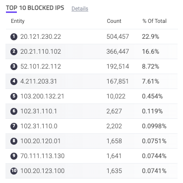 The Top 10 Blocked IPs component is a table of the most blocked IP addresses on your applications.