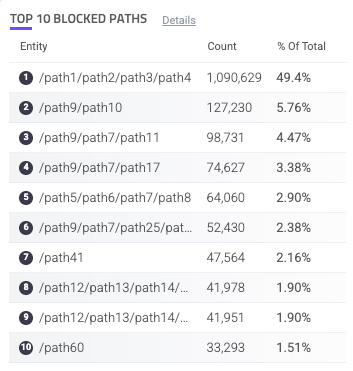The Top 10 Blocked Paths component is a table of the 10 unique paths on your applications that have the most blocked traffic. This is useful for viewing where bots are commonly going to on your applications.