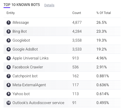 Each entry has a count of activity done by each bot as well as its % of total known bots. You can hover over a bot to copy