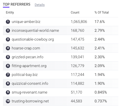 Each referrer is listed with the count of requests from that referrer and the % of total requests overall. You can hover over a referrer to copy
