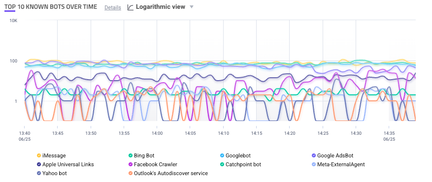 The Top 10 Known Bots Over Time component is a graph that shows the most common known bots’ activity on your applications over time. Sightline identifies these known bots based on HUMAN’s list of known bots and crawlers.