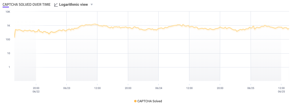 The CAPTCHA Solved Over Time component is a graph that shows the number of CAPTCHAs your users solved on your applications over time. This is useful for tracking how well humans are solving your CAPTCHAs compared to bots, especially after you make adjustments to your CAPTCHA.