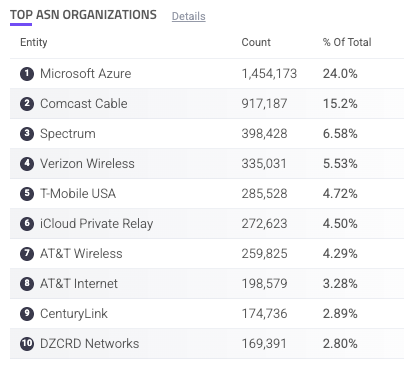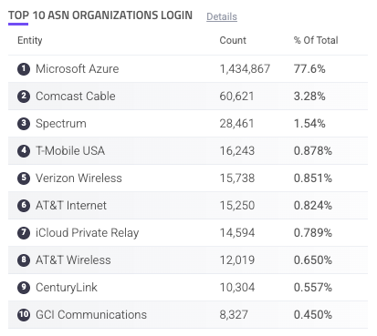 The Top 10 ASN Organizations Login component is a table of the most common ASNs that your login-related traffic comes from. If there’s a new ASN with unusual amounts of activity in this list, it might be worth investigating.