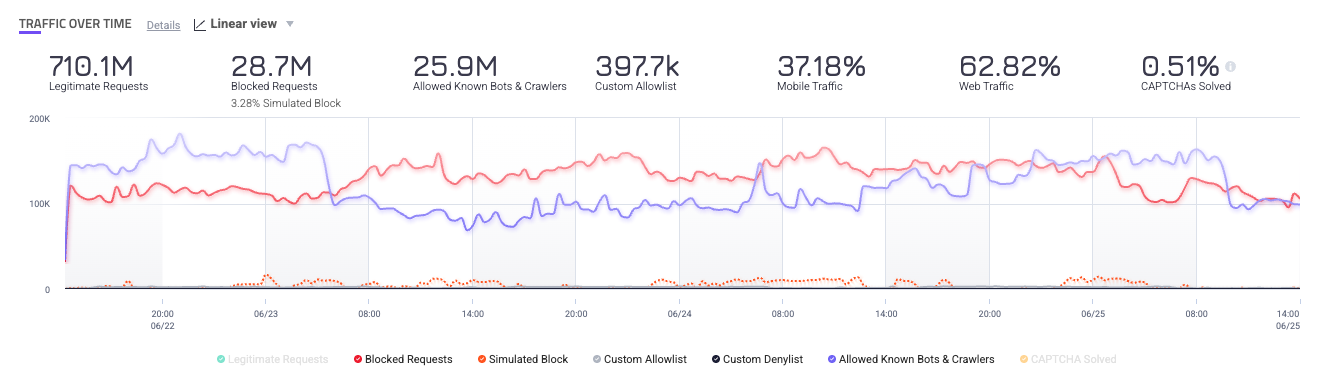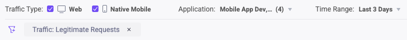 - Legitimate Requests: Requests with score outside the set score range. This excludes traffic from your Custom Allowlist.