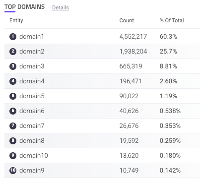 Each domain is listed with the count of requests on that domain and the % of total requests of all your applications that came from the domain. You can hover over a domain to copy