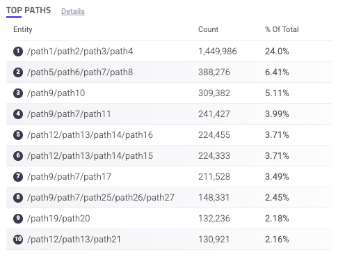 Each path is listed with the count of requests on that path and the % of total requests of all your applications that came from the path. You can hover over a path to copy