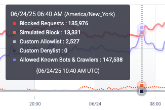 - Blocked Requests: Requests that were within the set score range and subsequently blocked by Sightline. This excludes blocked traffic from your Custom Denylist.