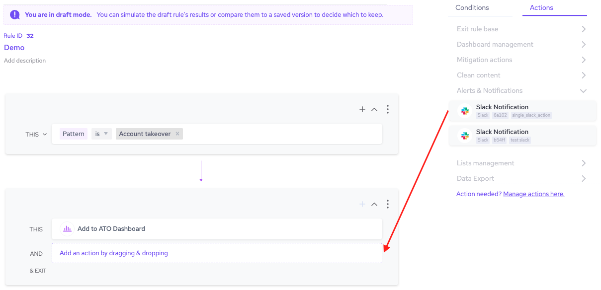 - From the Actions menu, click and drag Alerts & Notifications to the THEN field.