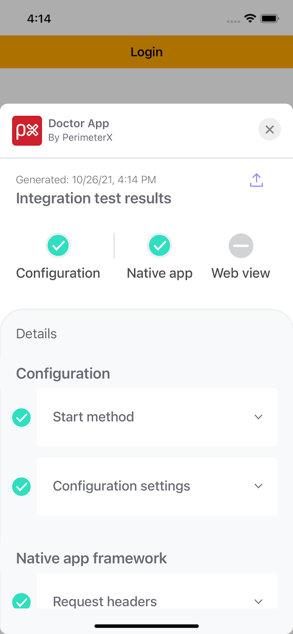 The SDK comes with integration verification tool - “Doctor App”. The “Doctor App” is a tool that helps verify the SDK integration in your project by simulating a typical user flow in the application. When the “Doctor app” is enabled, it will pop up as part of the app flow and will guide the developer on simulating a user flow to gather the required information for testing the integration.
