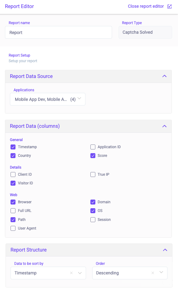 Custom Reports lets you generate summaries about solved CAPTCHA events with custom data sources, data, and structure. This lets you view the information you need at a glance. Once you have a report, you can return to it at any time to view updated data or export it as a CSV file.