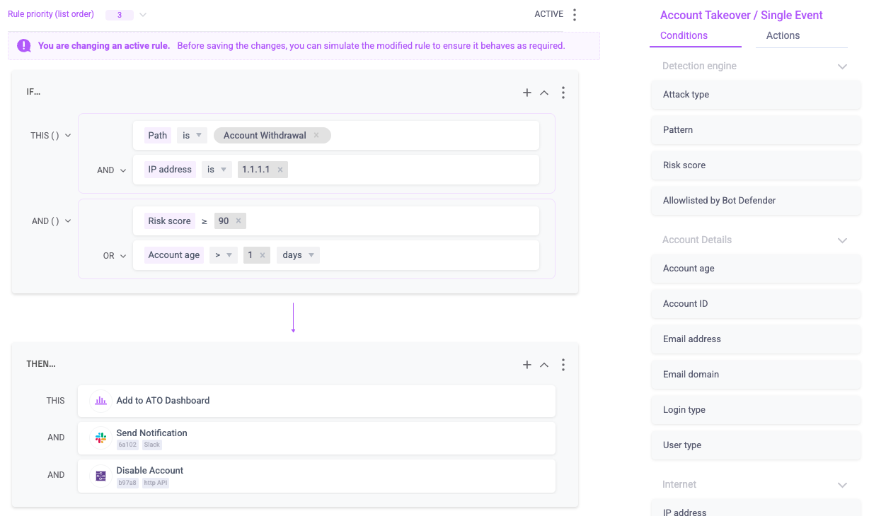 - If the account takeover is on an account withdrawal path AND comes from the IP address 1.1.1.1, AND