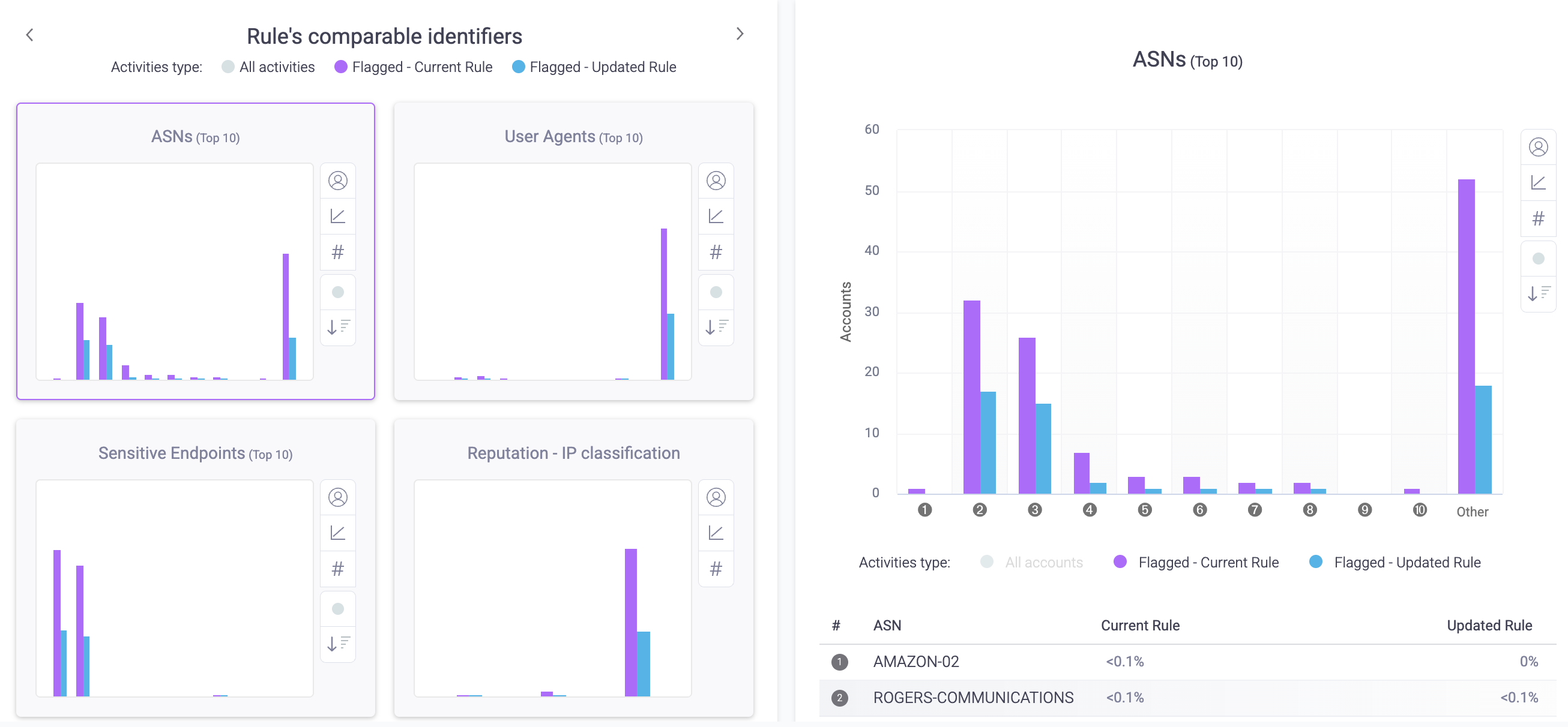The Rule’s comparable identifiers show the top 10 most prevalent identifiers for activity or accounts from the previous seven days that match your policy rule. If you’re updating an existing rule, it also compares the updated rule’s identifiers to the current rule’s. This is useful for understanding the characteristics of activities or accounts your rule will affect.
