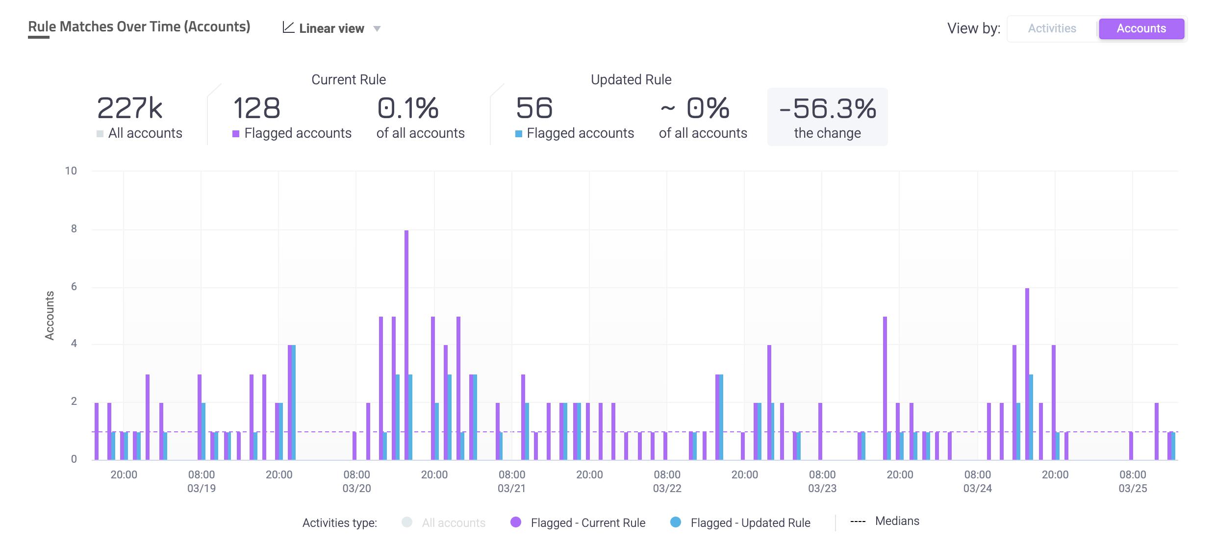 The Rule Matches Over TIme graph displays the Activities or Accounts from the previous seven days that match your policy rule’s conditions. If you’re updating an existing rule, it also compares the updated rule to the current one. This is useful for understanding the volume of activities or accounts that the rule will affect.