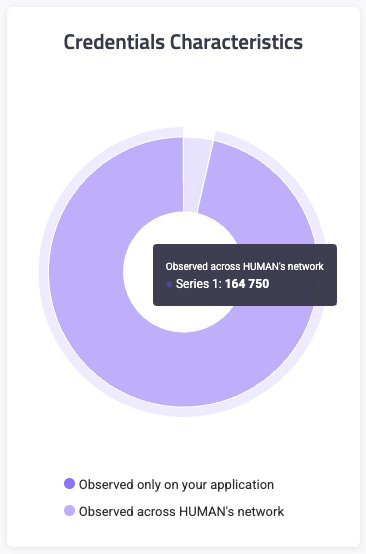 The Credentials Characteristics chart shows the distribution of compromised credentials Credential Intelligence detected directly on your applications as compared to the compromised credentials detected across HUMAN’s customer network. HUMAN observes credential stuffing attacks on our customers across the web, and we flag any compromised credentials that are used in these attacks. Note that HUMAN hashes, salts, and stores compromised credentials in our database. These credentials do not expire and are not exposed in the HUMAN console. You can request that HUMAN deletes these logs within 60 days