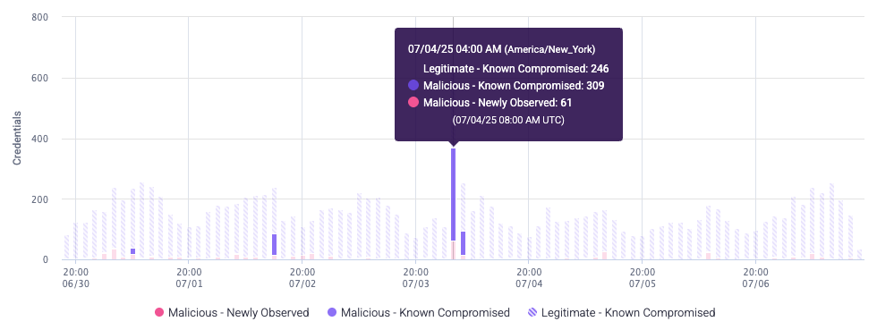 - All Malicious: The total number of malicious compromised credentials Credential Intelligence has detected over the time period. Credential Intelligence considers compromised credentials as malicious if it detects that a bad actor attempted to use them. Malicious credentials are further separated into two types: