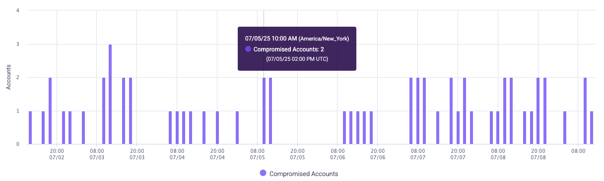 The Accounts Analysis graph shows compromised accounts over time. Credential Intelligence groups the accounts it detects at approximately the same time so you can more easily observe the distribution over time. Hover over a bar in the graph to see a detailed summary of compromised accounts at that time.
