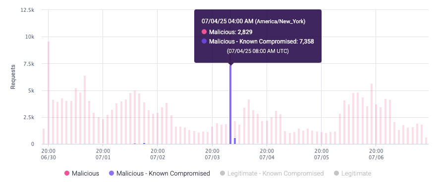 You can also hover over activity to see a detailed summary of requests made at that time. Malicious - Known Compromised accounts represent the combined value of Bot Mitigation and Credential Intelligence capabilities.