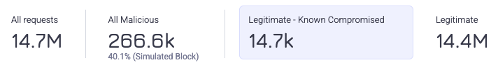 - Legitimate - Known Compromised: The total number of credentials that Credential Intelligence detects as compromised, but have only been used in legitimate requests so far.