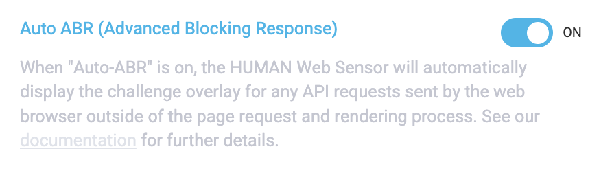 To enable the Advanced Blocking Response, turn on the ABR toggle, and click “Save Changes”. When “Auto-ABR” is on, the HUMAN Web Sensor will automatically display the challenge overlay for any API requests sent by the web browser outside of the page request and rendering process. See our documentation for further details.
