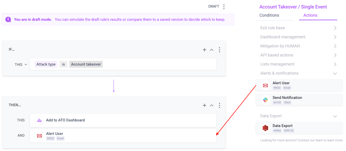 - From the Actions menu, click and drag Alert User to the THEN field.