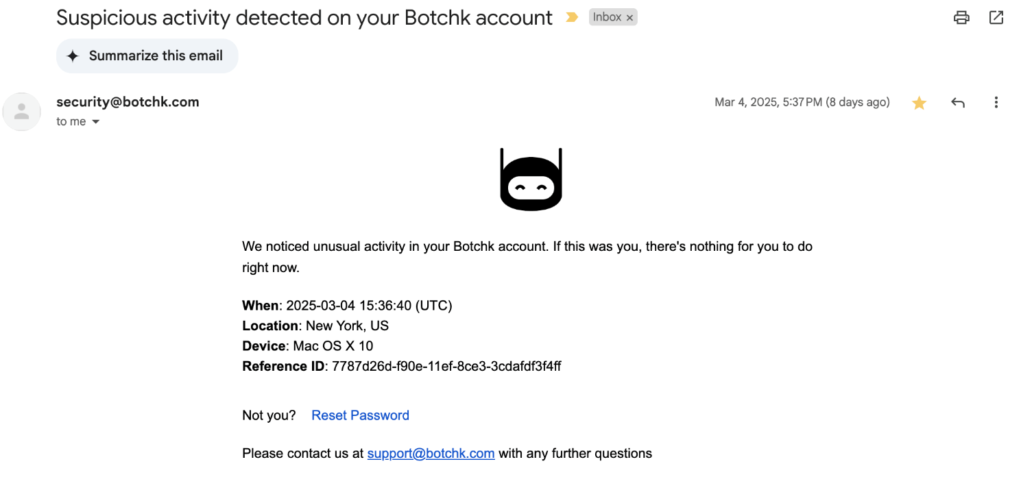 Now, whenever Account Defender detects an attack that matches the conditions in that policy rule, the account owner will receive an email notifying them that someone tried to access their account similar to the example below.
