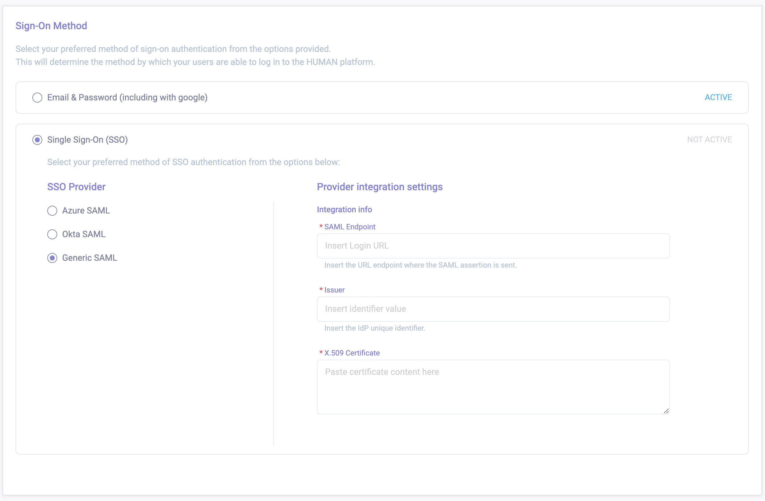 HUMAN supports logging in to the HUMAN Portal with Generic SAML SSO as the authentication provider.