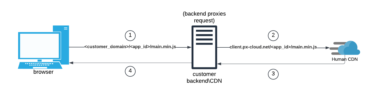To implement a first-party installation without an Enforcer, you must implement a reverse proxy through your backend. This passes the request for the Sensor resource through your backend to HUMAN’s CDN. The implementation details depend on your backend architecture and, in particular, whether the first endpoint your resource requests hit is a CDN, load balancer, etc.