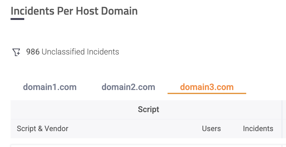 By default, the data in the portal is broken down by host domains, as Code Defender works optimally with this granularity. Meaning, in case an account includes multiple host domains, all data will be separate by host domain. This also means that incidents may be listed multiple times for each host domain they appeared on.