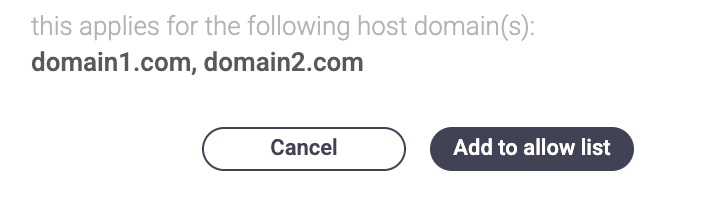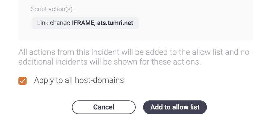 When adding one of these incidents to the allowlist or denylist, the user can choose to apply the action on the same incident across all host domains, using the Apply to all host domains checkbox.