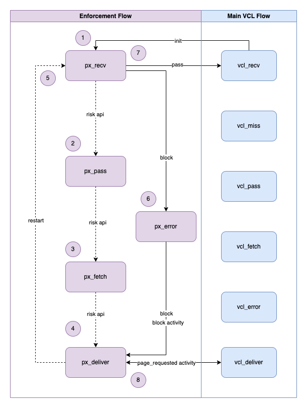 The flow appears to transition between HUMAN subroutines (e.g., px_recv directly to px_pass), but this is not exactly accurate. In reality, the px_recv subroutine executes a return(pass) statement to trigger a Fastly state transition. This invokes the vcl_pass hook subroutine, which then calls the px_pass subroutine within it. For this reason, it is crucial that the HUMAN subroutines are called at the beginning of every VCL hook subroutine.