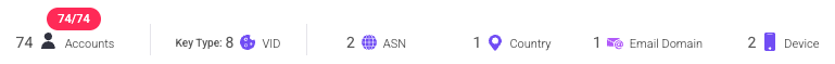 In this example, we can observe that there are 20 accounts shared by multiple identical identifiers: the VID, the device, the ASN, the country, and the email domain. Based on the VID alone, we can likely assume that this is a case of network FA, as it’s very unlikely for 20 accounts to have the same VID.