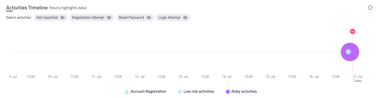 Next, we recommend you review the Account Activities Timeline. While the Overview helps you understand what occurred, the Timeline helps you understand when it occurred. This is important for determining a precise history of when the risky activities happened, and you can filter the timeline by specific risky activities. Using the same incident example as above, we can see that this account had one period of risky activity before Sightline mitigated it. Additionally, we know that the account was created on July 16th, and Sightline detected risky activity within one day. This can support the conclusion that this is a fake account, since we typically wouldn’t expect risky activities on a legitimate account so soon after it’s registered.