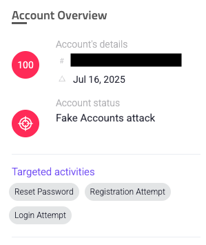 You can search for any account ID from the Fake Accounts investigation page regardless of whether that account was recently under attack. This means you can check any ID and see if it had an FA incident, even if that ID does not appear in Recent Attacks.