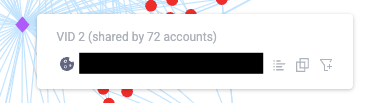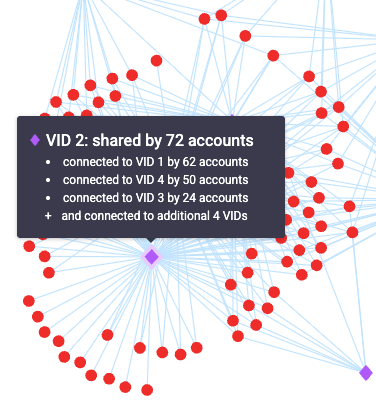 Networks with multiple VIDs show the connections between each VID and all the accounts that used them. You can hover over each account to learn which VIDs it’s connected to or over each VID to see how many accounts are related to it. An example of this is shown in the visualization below.
