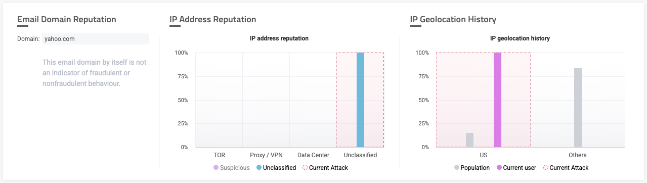 From this example’s Email Domain Reputation, we can see that this account used a Yahoo email domain. However, email domains are typically not strong enough of an indicator for fraudulent behavior, and we need to consider other information to draw a conclusion.
