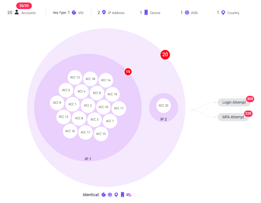 Additionally, we can see that these 20 accounts shared two IP addresses, and the visualization separates the accounts into two groups representing this. Not only did these 20 accounts share an identical VID, but 19 of them came from the same device. We typically would not expect this for legitimate accounts, which helps us conclude that this is likely a network event.