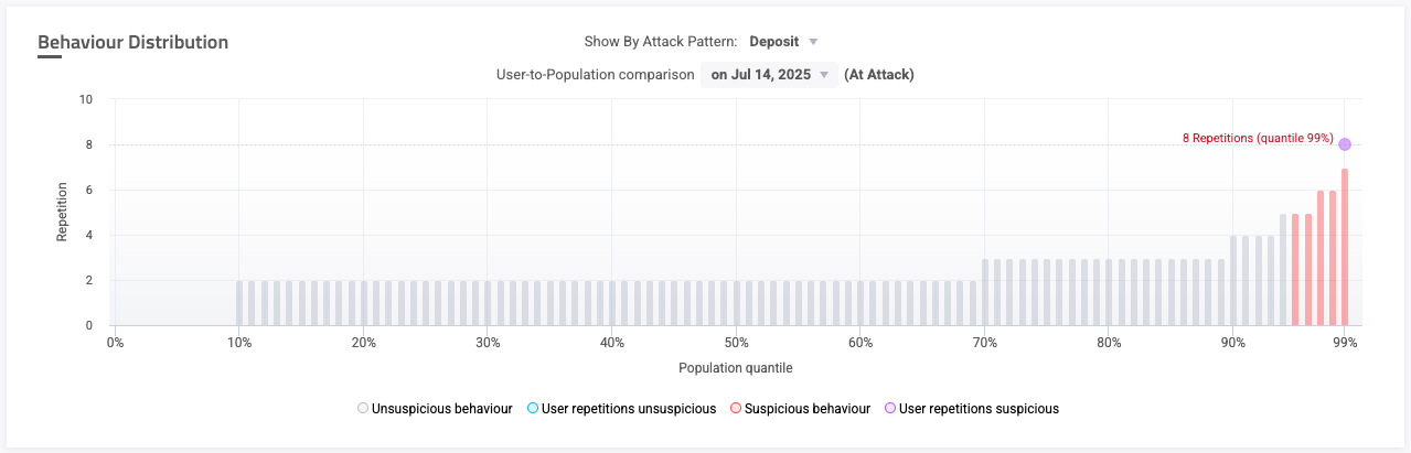 While we can observe some unusual characteristics about this account, we can’t assume it’s fraudulent based on this example’s reputation data. In order to come to a conclusion, we need to continue to investigate this account’s behavior. This can be done from the Behavior Distribution graph, which shows the population distribution against the number of repetitions an account performs a certain attack pattern. While it defaults to the pattern that Sightline detected activity on, you can choose different patterns with the Show by Attack Pattern dropdown selection. You can also choose a date to compare data to.
